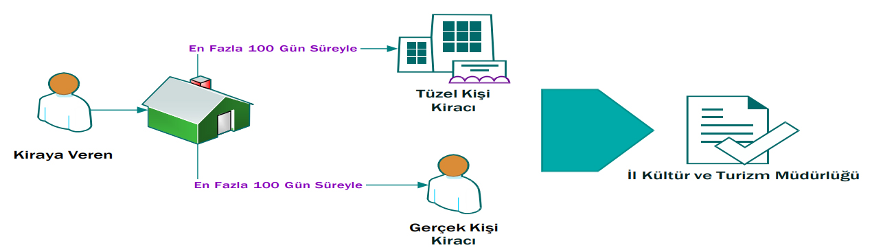 Kiralanan konutun kullanıcı tarafından hangi amaçla (eğitim, sağlık, iş, gezi, spor vb) kullanılacağına bakılmaksızın, konutların 100 gün ve daha kısa süreli kiralanabilmesi için turizm amaçlı kiralama izin belgesi alınması zorunludur.