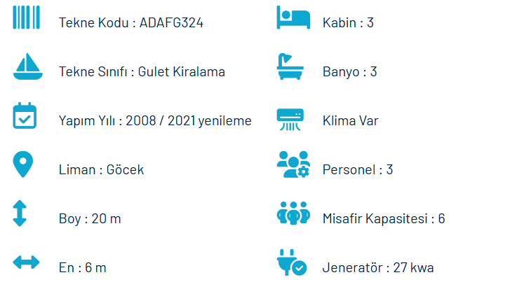 Tam boy 20 metre ve eni 6 metredir. Teknemizde 1 adet kaptan,1 adet aşçı ve 1 gemici olmak üzere 3 personel bulunmaktadır. Just freedom teknemizde Klima, su oyuncakları, jeneratör, su yapıcı gibi donanımlar mevcut olup mavi yolculuk tekne tatiliniz için her detay düşünülmüştür.