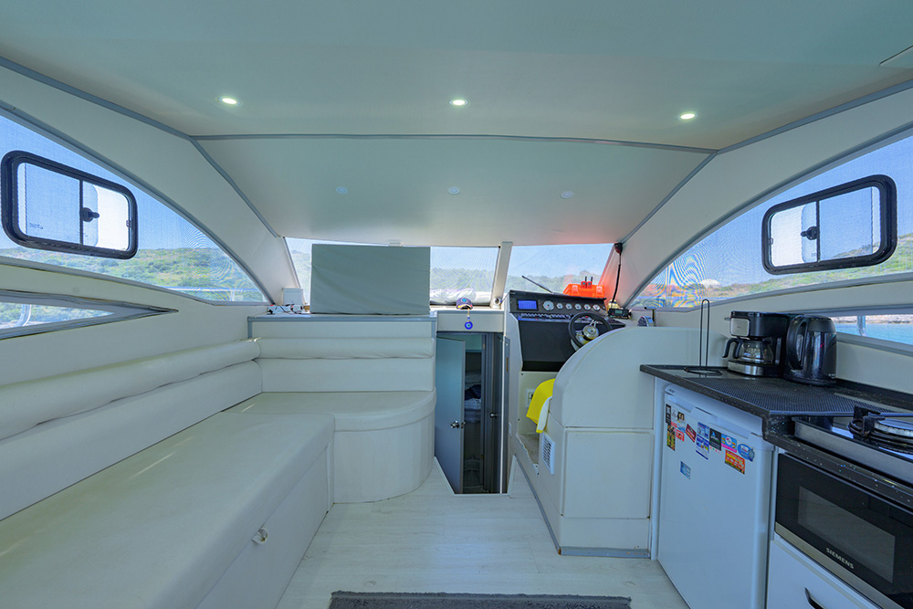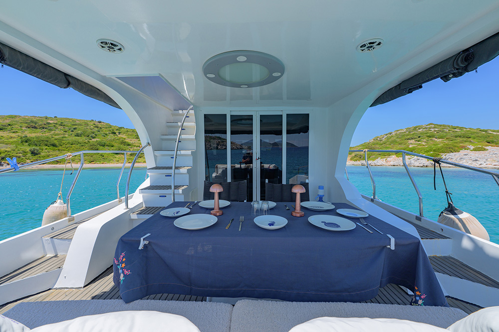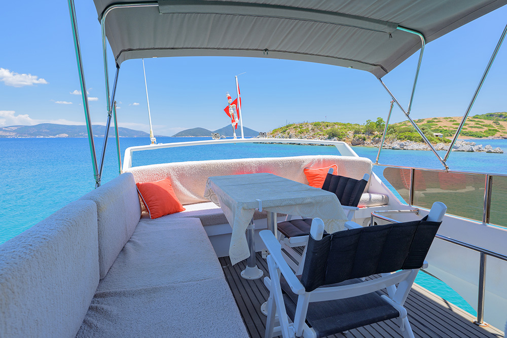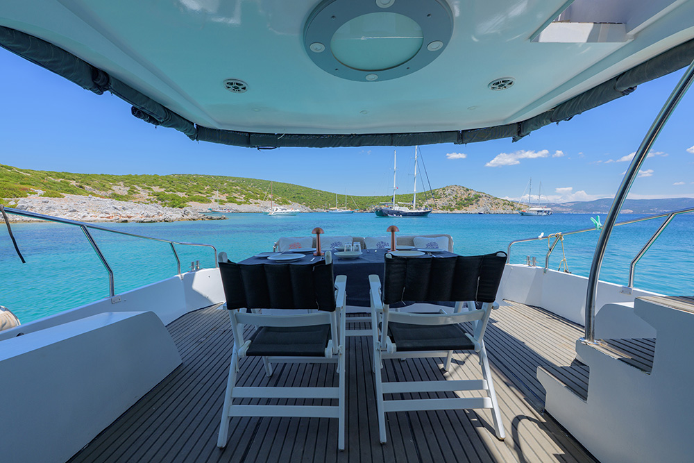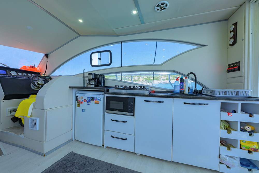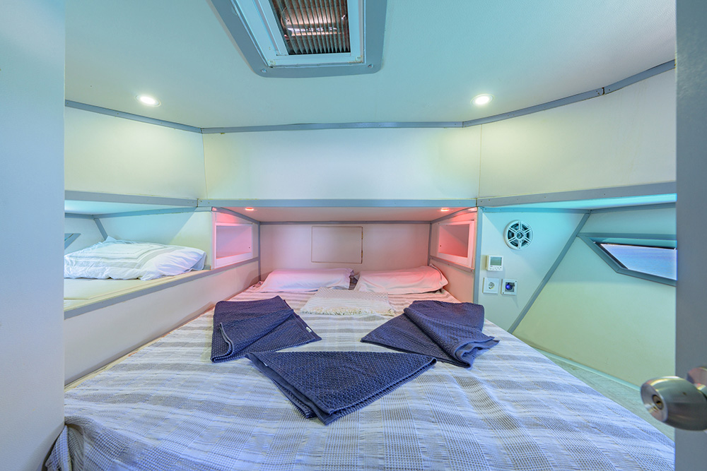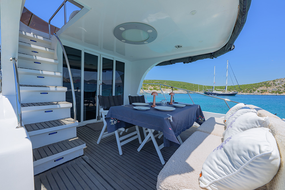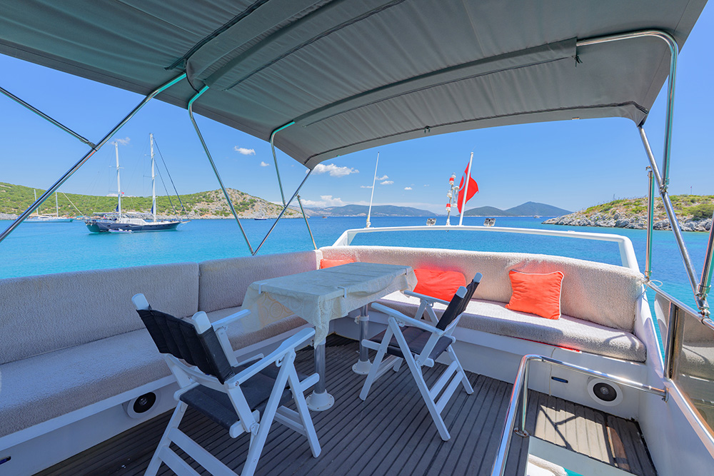 20 m., 1 master kabin, 3 double bed kabin. Aşçı, Garson, Kaptan. Teknede klima, buz makiması, su yapıcı, jeneratör vs herşey mevcuttur.