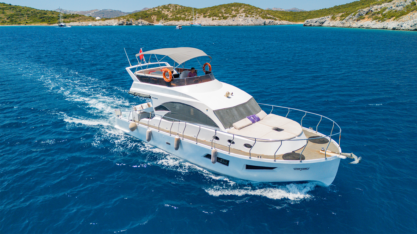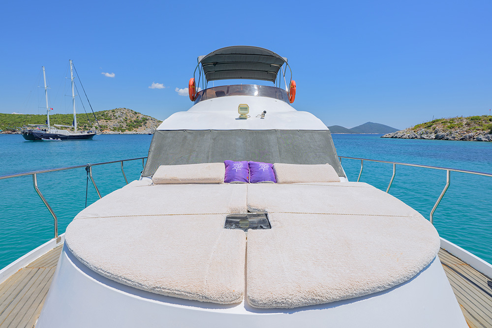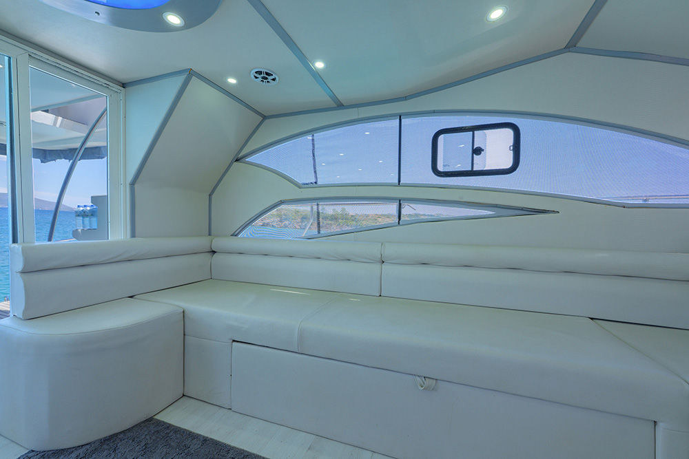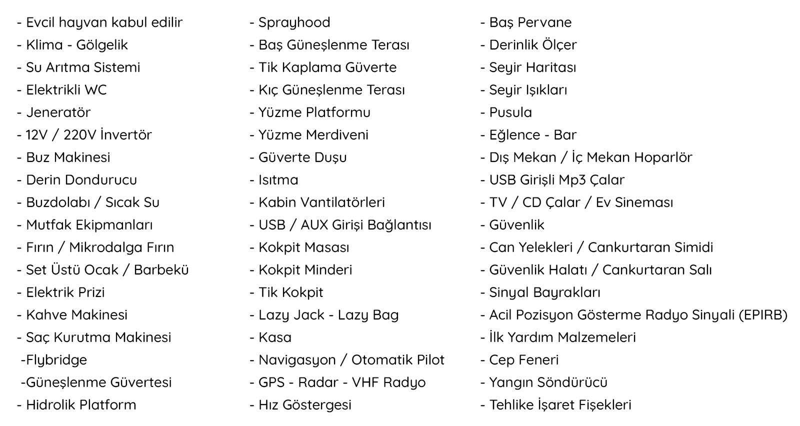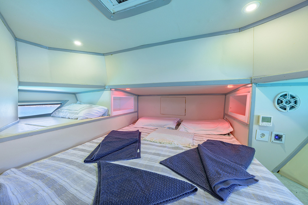 20 m., 1 master kabin, 3 double bed kabin. Aşçı, Garson, Kaptan. Teknede klima, buz makiması, su yapıcı, jeneratör vs herşey mevcuttur.